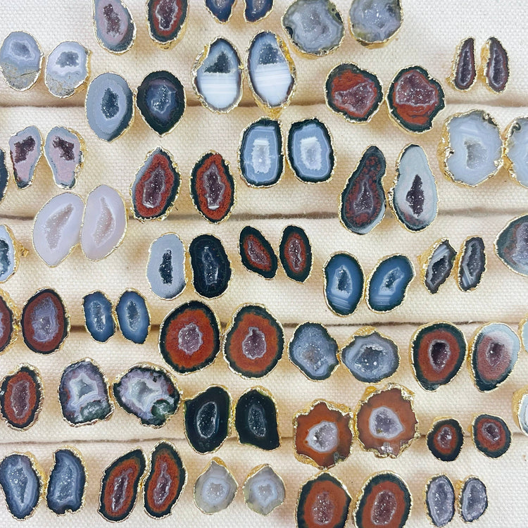 These earrings are made from beautiful agate geodes. The geodes are cut in half to create these earrings. The earrings are not exactly the same but are made from the same geode so they match as closely as possible. The geode are plated with gold on the edges and back.