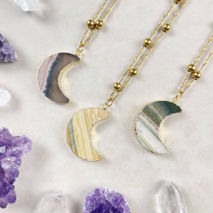 This necklace is made from natural jasper stones which are about 25-30mm in diameter. The jasper stones are cut into crescent moon shapes and are gold plated all around. The necklace is finished off with a gold plated stainless steel satellite twist curb chain.