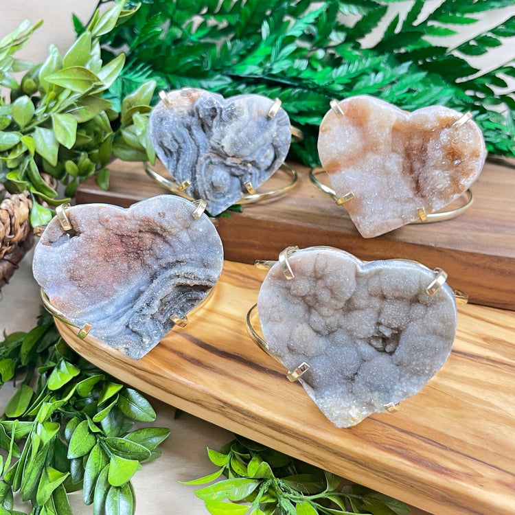 This listing is for one arc cuff bracelet with a chalcedony druzy stone. The chalcedony druzy is cut into a heart shape. Each bracelet has a unique galaxy like chalcedony druzy stone. The stones are set on top of the arc cuff with four prongs.