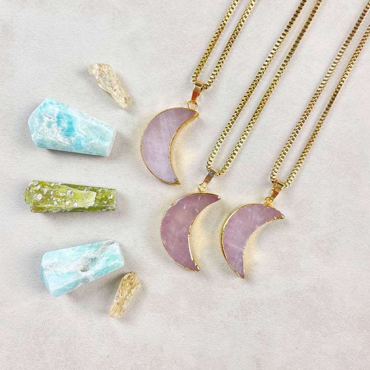 This necklace is made from natural rose quartz stones. The stones are cut into crescent moon shapes and are gold plated on the edges. The necklace is finished off with a gold plated stainless steel cable chain.